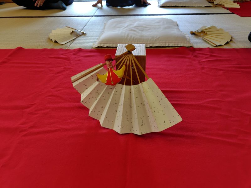 今回は扇遊連の雄扇殿と体験で杉杉殿(幸月殿のお知合い)が参加されました。非常に蒸し暑いので、室内のクーラーを止めて廊下のクーラーのみ(障子を開けて)で行いましたが、風の影響は少ないようでした。